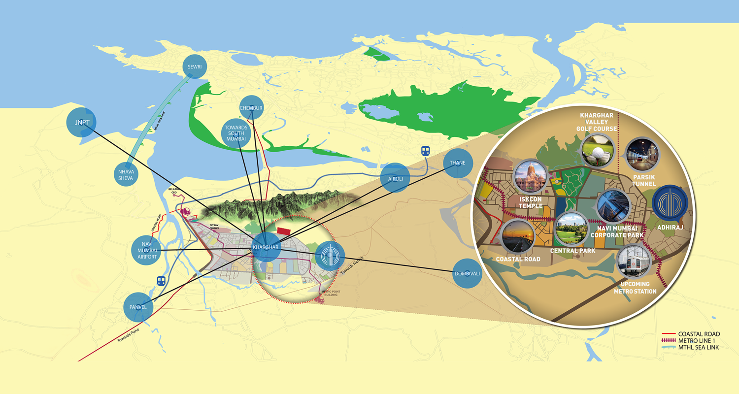 Navi Mumbai, and specifically, Kharghar! The pulsating, emerging NEW NERVE CENTER for the Mumbai Metropolitan Region. A better planned option for Mumbai. And Adhiraj Capital City, Kharghar, is at the heart of this rapidly-growing centre