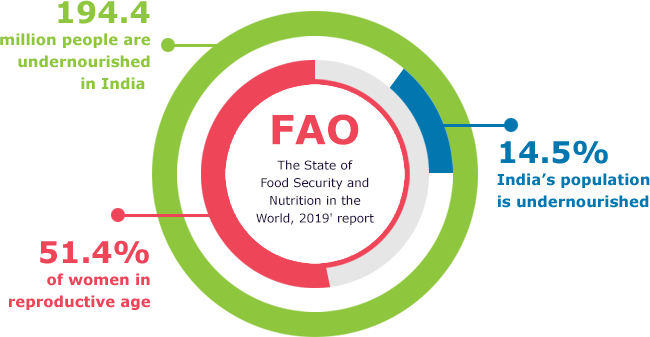 According to FAO estimates in ‘The State of Food Security and Nutrition in the World, 2019' report, 194.4 million people are undernourished in India which means 14.5% India’s population is undernourished. Also, 51.4% of women in reproductive age between 15 to 49 years are anemic.