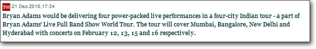 Multi City Concert Tours in India for Bryan Adams.